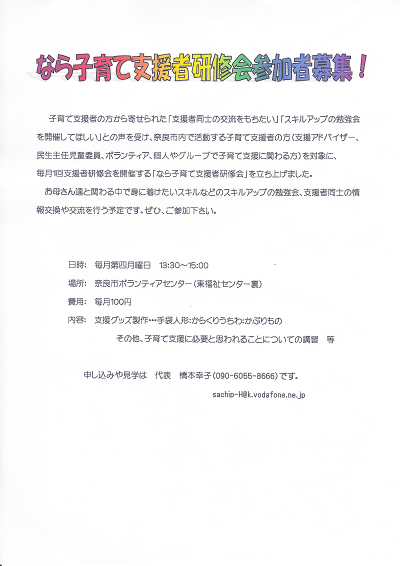 - 奈良市内の子育て支援者(支援を目指す人)のための研修会です。組織を超えてのネットワーク作りや、スキルアップを目的に毎月勉強しています。詳しくはコチラ